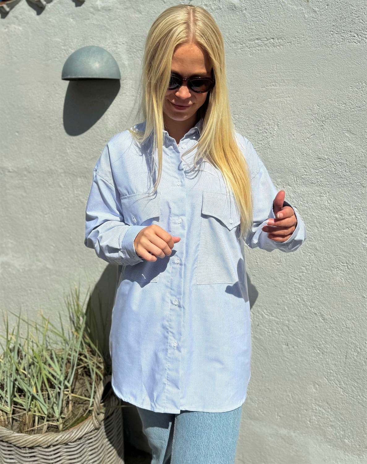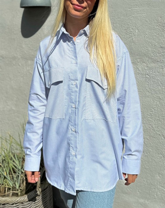 Cajsa Skjorte - KalstrupLækker oversized skjorte. Fås med både smal og bred strib.Store lommer foran. Den lækre Cajsa skjorte fås i to slags striber - begge i blå nuancer. Skjorten kan styles sejt til et par jeans fra Only eller Global F.