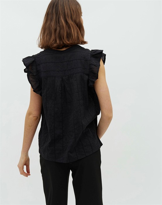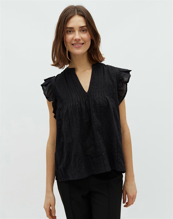 • Toppen har fine feminine detaljer med flæser ved ærmerne samt v-udskæring.