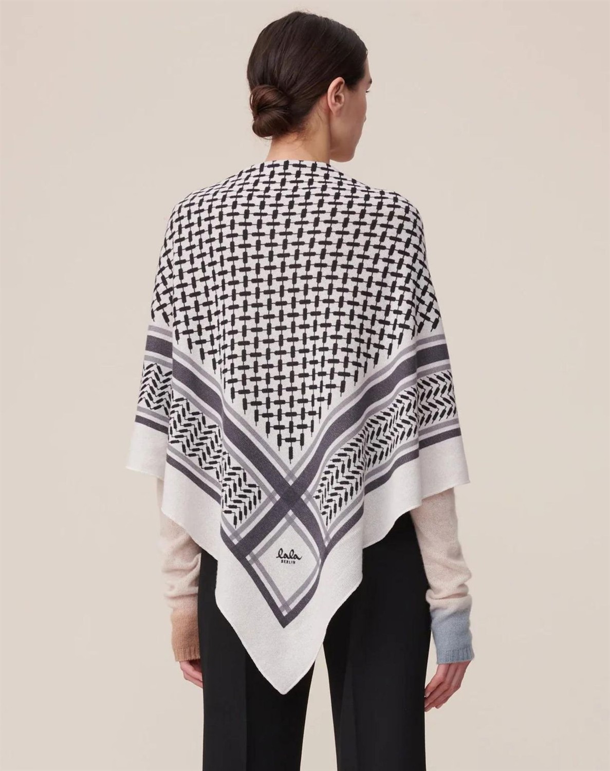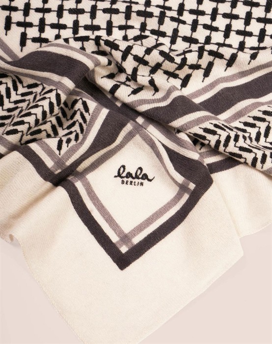 Skønt tørklæde i lækker cashmere uldkvalitet fra Lala Berlin. Tørklædet er trekantet, og har det genkendelige Kufiya print samt det ikoniske Lala Berlin logo foran. Lala Berlin halstørklæderne har gennemgået en særlig vask, som gør den ulden ikke fnuller eller bliver grim, hvilket giver tørklædet en lang levetid.