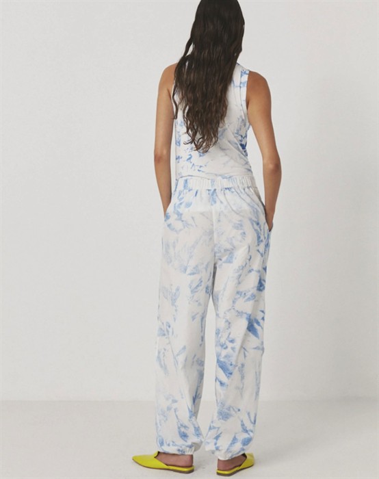 Limar Fracture Elastic Hem Bukser - Rabens SalonerLækre bukser i et flot blå håndlavet mønster.Let materiale.Elastik i taljen.Lommer i siderne.Elastik nederst i benene.Afslappet pasform.Style de lækre Limar bukser fra Rabens Saloner med en skøn hvid skjorte eller t-shirt til sommerens dejlige vejr. Tilføj dine yndlings sandaler fra Birkenstock dertil.