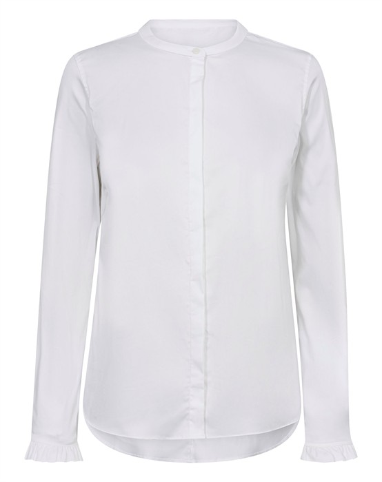 Denne smarte og feminine skjorte fra Mos Mosh damekollektion er perfekt til dig, der elsker at kombinere et klassisk look med et feminint strejf. Denne lækre skjorte i blød poplin kvalitet har smart kinakrave i halsen og flæser i ærmekanterne - begge dele detaljer, der gør skjorten både spændende og feminin. Så elsker du stilrent og klassiske designs på pigeskjorter, men helst vil undgå et decideret herrelook, så er Mattie skjorte fra Mos mosh dame lige noget for dig. Skjorten er samtidig blød og fleksibel, så den er rar at bære.