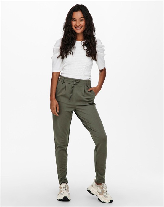 Poptrash Bukser - Only Poptrash Bukser fra Only. Lækre bløde bukser med en afslappet pasform og fitted ben. De er i et let strækbart viskose materiale, der gør de falder flot. Bukserne er med både elastik og bindebånd i livet. De har både lommer foran og bagpå. Du kan både style disse lækre bukser afslappet med en comfy strik og loafers, eller fint med en skjorte og støvler. Bukserne fås i flere farver.
