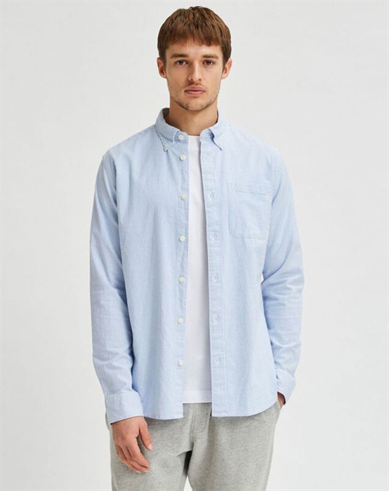 klassisk skjorte fra Selected. Skjorten har lange ærmer, klassik krave og gennemknappet. Den har en normal pasform, som gør den komfortabel at have på. På det ene bryst har den en lomme, som både er praktisk og super cool. Perfekt skjorte til både hverdag og aften. Brug den åbenstående med t-shirt, denim jeans og sneakers eller blazer, bukser og pæne sko alt efter hvilket look der måtte ønske Oplev alle de lækre styles fra Selected her