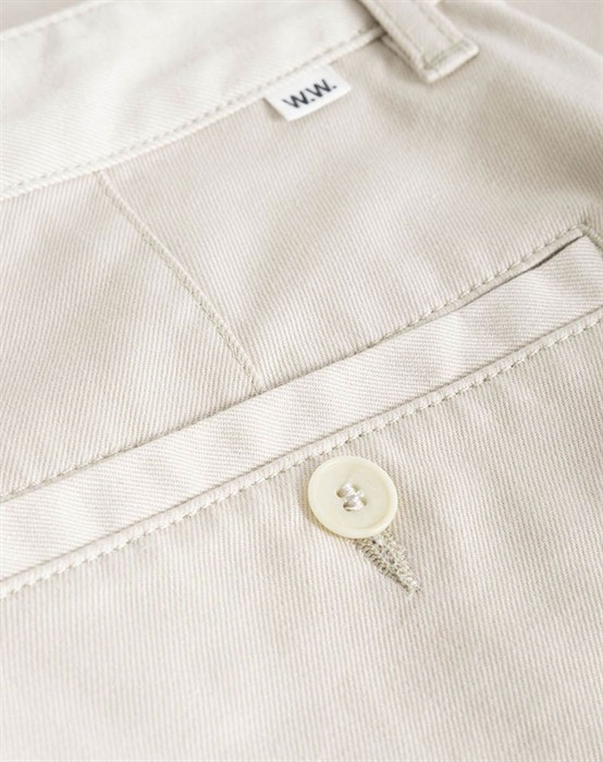 Lækre bukser til mænd fra Wood Wood. Bukserne har klassiske bæltestropper og lommer foran og bagpå. Derudover har de knap foran samt en metallynlås. De er fremstillet i 100% økologisk bomuld, som føles behagelig at have på.
