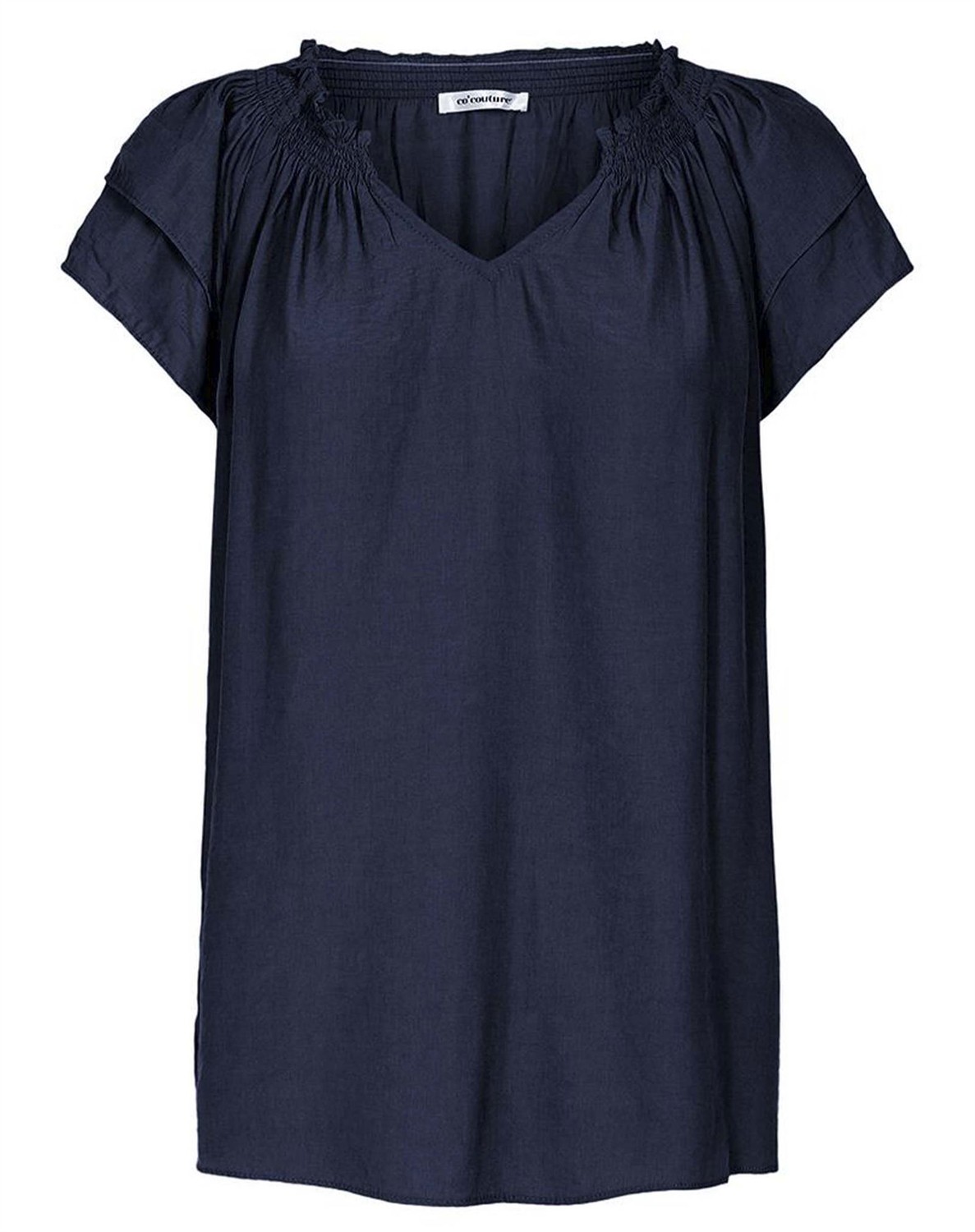 Skøn top fra Co’Couture i et tyndt og let materiale der gør, at den falder flot og elegant. Den har v-udskæring i halsen samt elastik i ryggen der giver et feminint look samt korte ærmer med flæse. Den har en komfortabel pasform der passer til enhver kropstype.